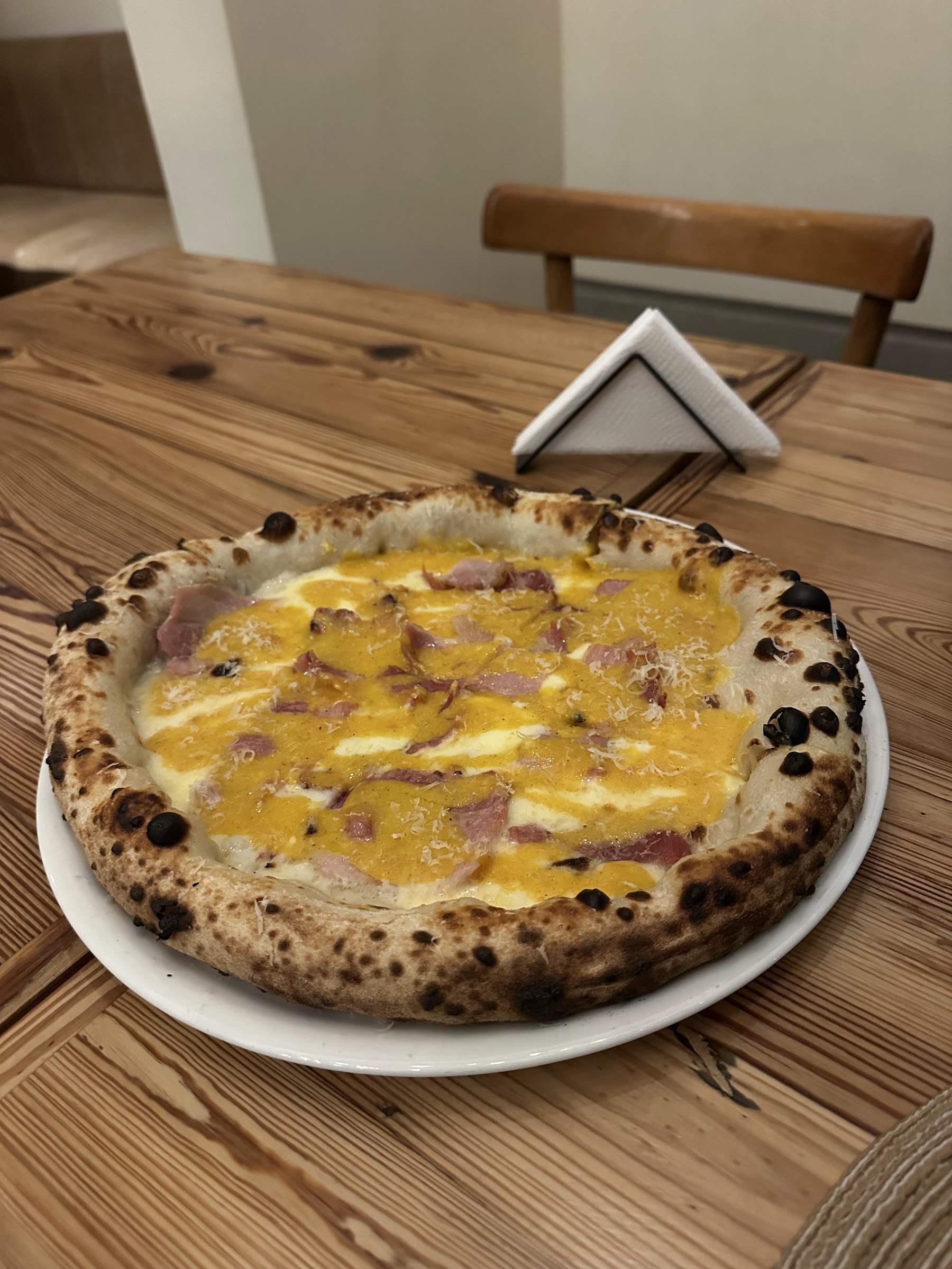 Carbonara, 4 Formaggi y Tartufata son las estrellas. De entrada: Focaccia Parma o Stracciatella. Carbonara, 4 Formaggi and Tartufata are the stars. Starters: Focaccia Parma or Stracciatella.